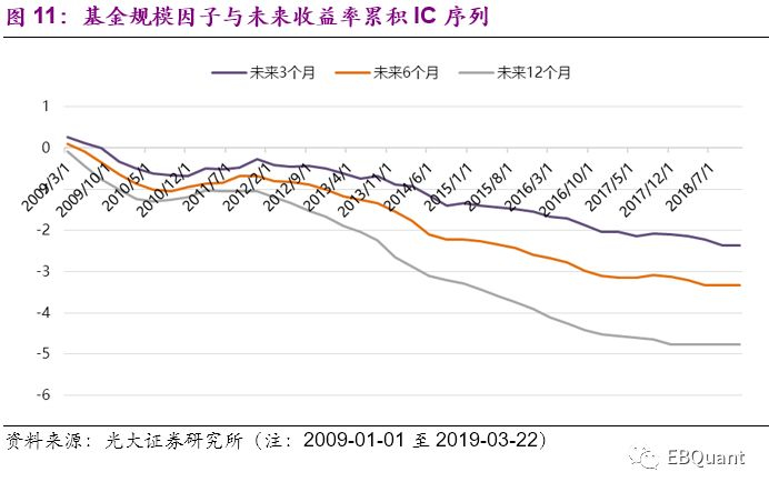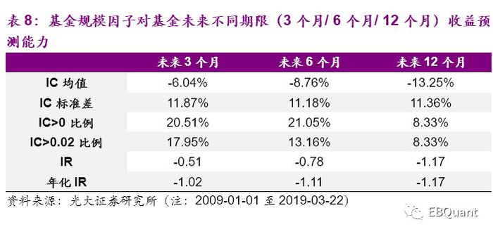 从IC序列的特征分析,基金当期规模与未来业绩呈现出明显的负相关性。说明总体来看,基金当期规模越大,其未来一年的业绩排名靠后的概率越高,因此在实际投资中,不仅规模不足5000万的迷你基金需要警惕,规模过于大的爆款基金同样存在风险。