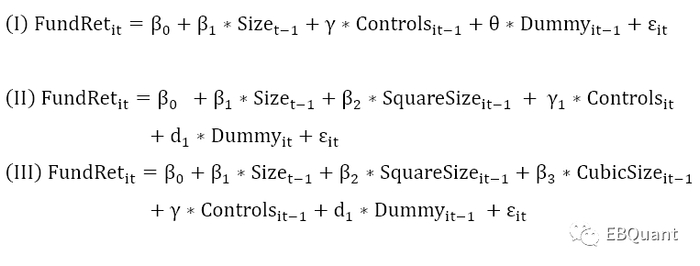 模型(I)考察了基金规模与业绩之间是否存在线性关系,模型(II)考察了基金规模与业绩之间是否存在二次关系,而模型(III)则为了检验模型两者之间三次关系是否成立。
