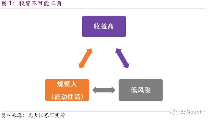 投资不可能三角:规模掣肘收益增长。我国的《公开募集证券投资基金运作管理办法》对基金投资有严格的规定,其中最重要的就是我们通常所说的“双十”限制。第一个“十”是指一只基金持有一家上市公司的股票,其市值不能超过基金资产净值的10%;另一“十”是指,同一基金管理人管理的全部基金持有一家公司发行的证券,不得超过该证券的10%。[[1]]这样规定的初衷是防止基金机构投资过于集中到某些个股上而造成流动性风险,然而这一规定也一定程度限制了基金规模的扩张。