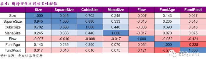 基金规模指标与其他控制变量之间相关性较低,能够从不同角度解释业绩差异。除了三个主要解释变量规模、规模平方和规模三次方之外,其他解释变量之间的相关性均处于相对低位,仅基金年龄与基金家族规模和规模的三次方分别呈现微弱的负相关和正相关。