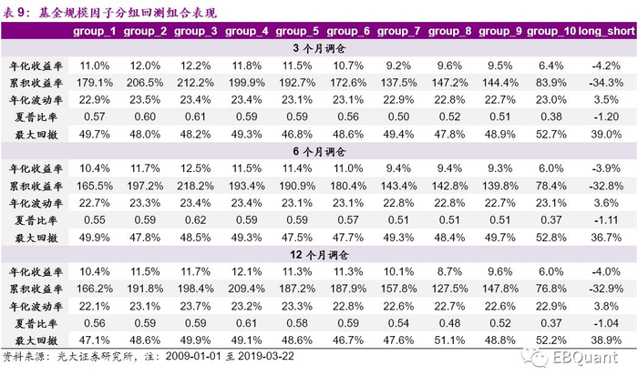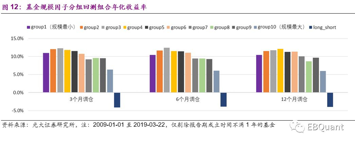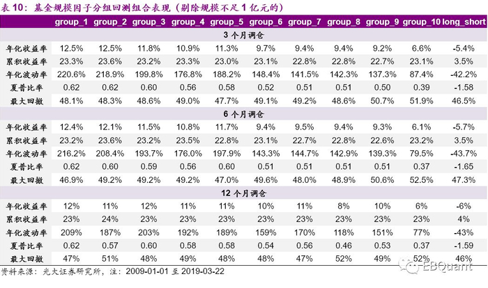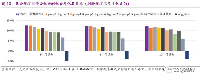 我们将偏股型基金分别按照上一季度的基金净资产从小到大排序等分10组,计算从2009年1月至2019年3月22日的基金规模最小的组合,依次到规模最大的组合,分别按3个月、6个月、12个月的频率调仓的历史回溯组合收益率。