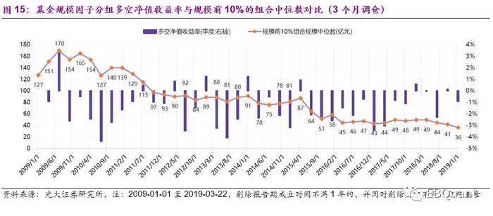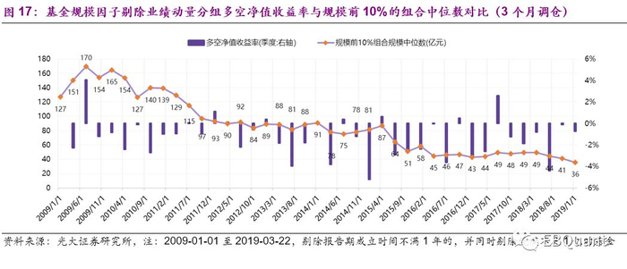 最后,为了进一步验证规模因子自身对于基金未来业绩的影响,我们通过横截面回归取残差的方式,剔除业绩动量因素,实证结果显示:规模因子对于基金未来业绩的预测性,的确存在历史业绩的贡献,但剔除动量因子后仍然有效,规模最大基金组合依旧稳定跑输小规模基金。