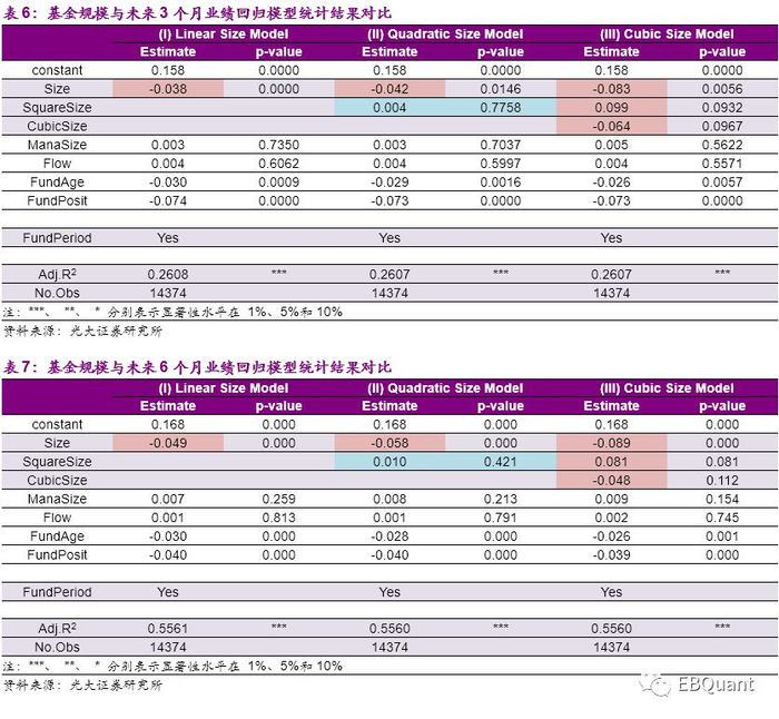 [1] 基金规模及其他控制变量对基金未来半年业绩解释程度更高。一阶/二阶/三阶多项式回归模型的拟合优度R2差异非常小,基金规模及其他控制变量对于基金未来3个月业绩的解释程度在26%左右,而对于基金未来6个月的业绩解释程度明显上升,调整R2在55%左右。