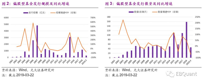 偏股型基金发行规模增速放缓。(1)规模变化:偏股型基金近二十年来年发行规模不同年份之间波动较大,其中在2007年和2015年一度达到了发行高峰,但2015年之后伴随着牛市热潮褪去,偏股型基金的发行规模快速下滑;根据Wind统计数据,截止2019年3月22日,本年度共发行主动偏股基金276.63亿元。(2)数量变化:偏股型基金的发行数量整体呈上升趋势,2015年、2017年和2018年全年发行数量超过100只,截止2019年3月22日,本年度共发行开放式主动管理基金46只。
