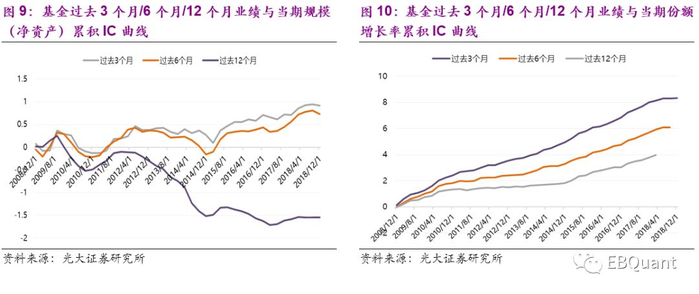 于是,我们再检验过去3~12个月基金业绩与当期份额增长率的历史IC序列发现:历史表现越优秀的基金,其份额增长率越高,反映了投资者在申购基金时,历史业绩是其重要考量因素。