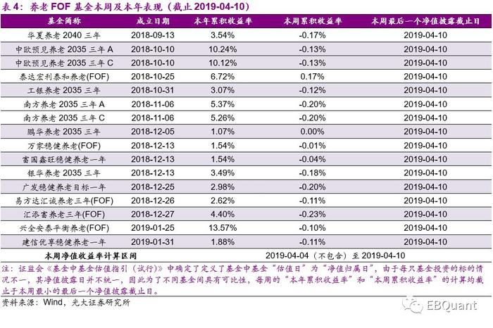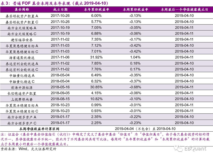 普通FOF基金:本周(2019-04-08至2019-04-12):FOF基金普遍下跌,其中海富通聚优精选涨幅领先,单周涨幅为1.04%。本年以来(2019年以来):FOF基金基本都能获得正收益,多数基金累积收益率超过5%,海富通聚优精选和前海开源裕源涨幅依旧领先,年初以来涨幅分别达31.92%和30.85%。