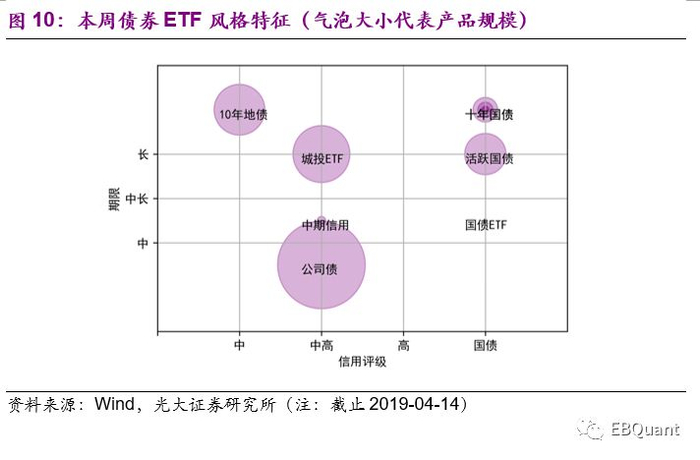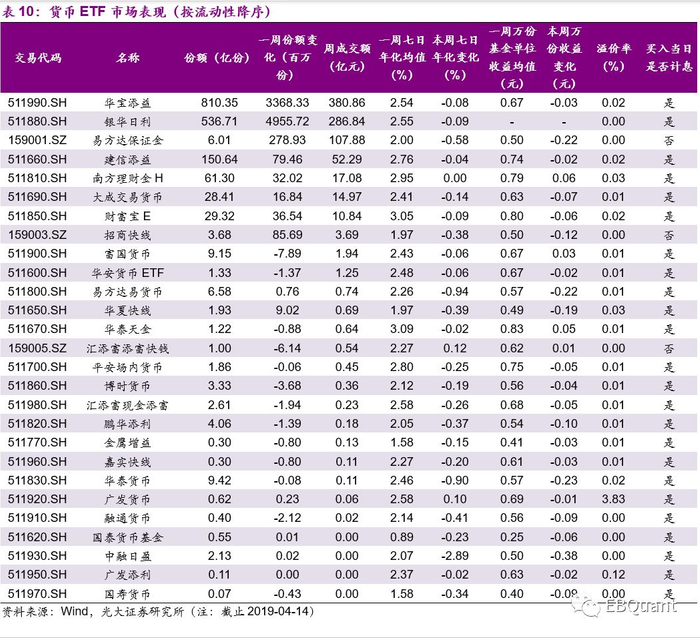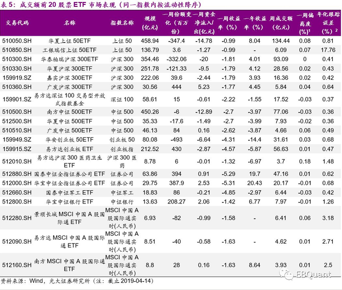 本周流动性较好的20只股票ETF整体回调, 股票ETF整体活跃度较高。截止本周最后一个交易日(2019-04-12),最活跃的权益ETF为华夏上证50ETF,周成交额达134.44亿元;最活跃的沪深300ETF为华泰柏瑞沪深300ETF,周成交额93.09亿元;最活跃的中证500ETF为南方中证500ETF,周成交额77.06亿元;最活跃的创业板ETF为易方达创业板ETF,周成交额56.63亿元;最活跃的非宽基类ETF为国泰中证全指证券公司ETF,周成交额47.16亿元。