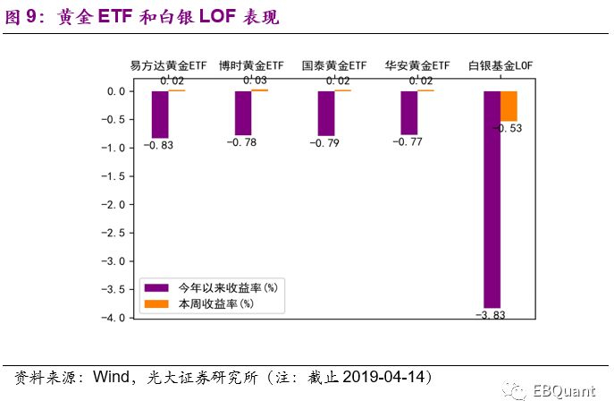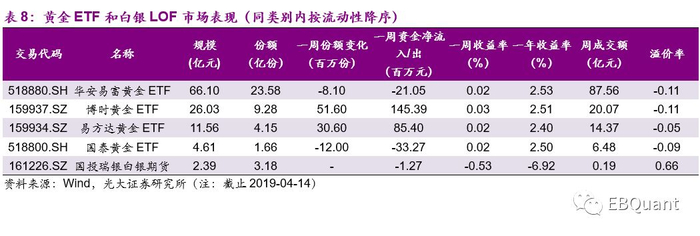 黄金ETF和白银LOF市场表现:本周黄金ETF基金微涨,白银LOF基金下跌。白银基金LOF作为市场上唯一一只跟踪白银期货走势的基金,本周单周收益率为-0.53%,今年年初(2019年)以来收益仍为负;黄金ETF本周小幅上涨,单周收益率均在0.02%左右;其中华安黄金ETF表现活跃,单周成交额远超其他三只黄金ETF,达到87.56亿元。(注:此处收益率指净值收益率)
