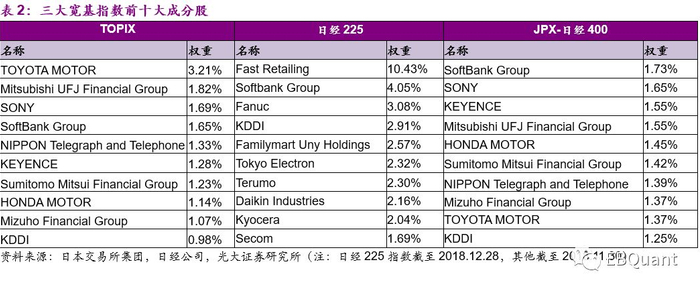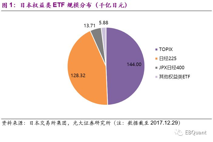 在日本全部宽基指数ETF中,前三大宽基指数TOPIX、日经225、JPX-日经400对应的ETF虽仅有20只,但截止2017年底其规模占据国内权益类ETF总规模的98%,其中TOPIX指数占据了近一半规模,日经225指数也占据40%以上。
