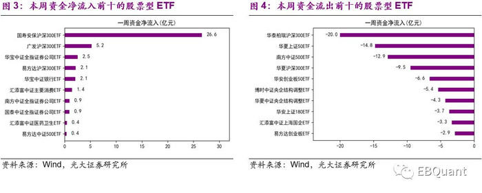 本周股票型ETF资金净流出67.58亿元。其中国寿安保沪深300ETF资金净流入大幅领先,达到26.6亿元,其次为广发沪深300ETF和华宝中证全指证券公司ETF。而本周资金净流出最高为华泰柏瑞沪深300ETF,达20亿元。