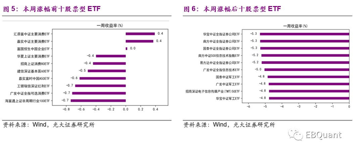 本周股票ETF普跌,仅消费ETF涨幅较高。汇添富中证主要消费ETF和嘉实中证主要消费ETF领跑,单周涨幅均为0.4%,富国恒生中国企业ETF微幅收涨,其他股票ETF均收跌。而对比之下,证券、军工类ETF表现相对较差,跌幅在5%左右。