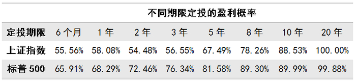 注:上述盈利概率测算以历史数据为依据,仅供参考,不作为收益承诺。将上证指数和标普500指数模拟为基金进行测算,每期扣款金额为1000元,首期扣款日为指数上市日,定投截止日为2016年2月29日,期间每月1号为定投扣款日,定投收益率=[(sum(每期定投金额/每月月初收盘点位)*期末收盘点位)/(sum(每期定投金额*投资期数))]-1。