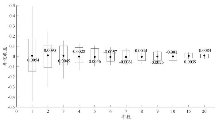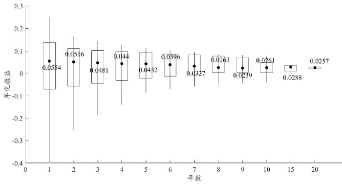 注:竖线的上方终点代表该投资期限下年化收益率的最高值,下方终点代表年化收益率最低值;长方形的上边短边代表该投资期限90%分位的年化收益,下边短边代表该投资期限10%分位的年化收益。