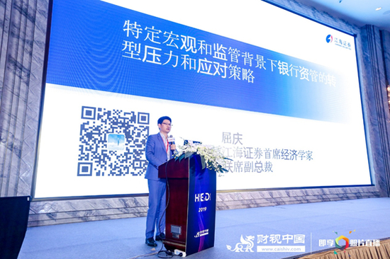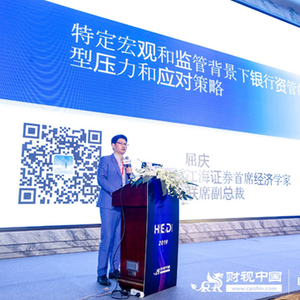 江海证券首席经济学家、联席副总裁屈庆以《特定宏观和监管背景下,银行资管的转型压力以及应对策略》为题发表了演讲。