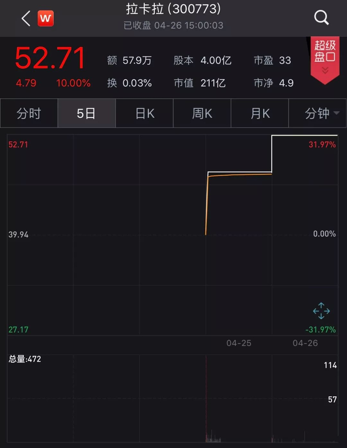 4月25日,拉卡拉在深交所上市,成为创业板上市公司。当日,拉卡拉大涨44%,次日继续涨停,上市两日涨幅达54%,市值涨超70亿元,最新股价报52.71元。