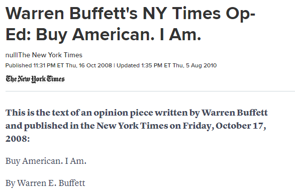 78岁的巴菲特在金融危机中写下《Buy American. I Am.》,发表在纽约时报。