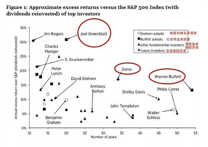 最右边的那个点,代表的就是巴菲特的投资业绩。在长达55年的时间里,他以近15%年化超额收益碾压所有的投资大师。