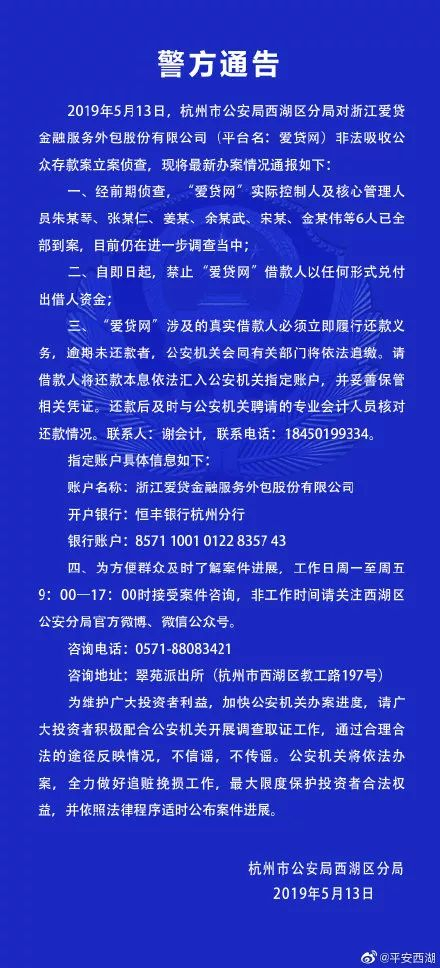 又一家网贷平台因涉嫌非法吸存被立案侦查。5月13日,杭州市公安局西湖区分局发布案件情况通报,称对P2P平台爱贷网(浙江爱贷金融服务外包股份有限公司)非法吸收公众存款案立案侦查,目前该平台实际控制人和核心高管等6人已经全部到案。