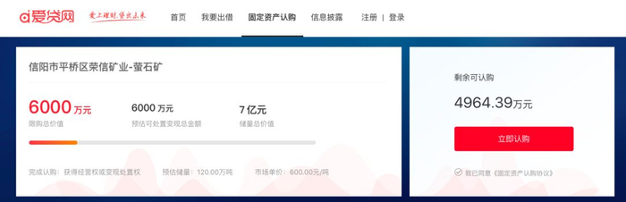 平台官网“固定资产认购”一栏显示,该固定资产为信阳市平桥区荣信矿业-萤石矿,该平台占比权益为50%,价值不低于6000万元,并声称已进入开采阶段。目前,投资者已经认购超过1000万元。