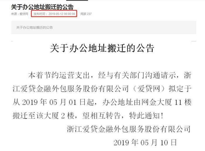值得注意的是,在被立案的前一日,也就是5月12日,爱贷网还在官网发了一则《关于办公地址搬迁的公告》,声称为了节约运营支出,经与有关部门沟通请示,公司自5月1日起,办公地址由网金大厦11楼搬迁至该大厦2楼。