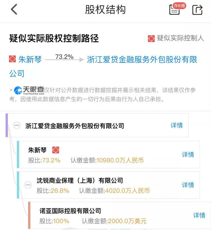 不过,最新工商信息显示,爱贷网股东仅剩朱新琴和沈锐商业保理(上海)有限公司,天眼查股权穿透显示,朱新琴持股比例为73.2%,为公司实际控制人,沈锐商业保理(上海)有限公司持股26.8%。