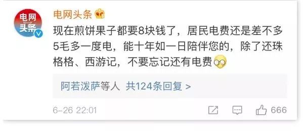 与此同时,国家电网及南方电网也纷纷加入进行科普。@电网头条 的回复是:现在煎饼果子都要8块钱了,居民电费还是差不多5毛多一度电,能十年如一日陪伴您的,除了还珠格格、西游记,不要忘记还有电费。