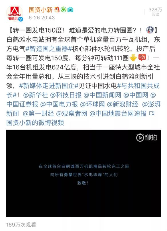 近日,@国资小新 发布一则爱的电力转圈圈,转一圈发电150度,说的是我们电力发展成就,“白鹤滩水电站拥有全球首个单机容量百万千瓦机组”,一年16台机组发电624亿度,相当于一座特大型城市全社会全年用量总和。