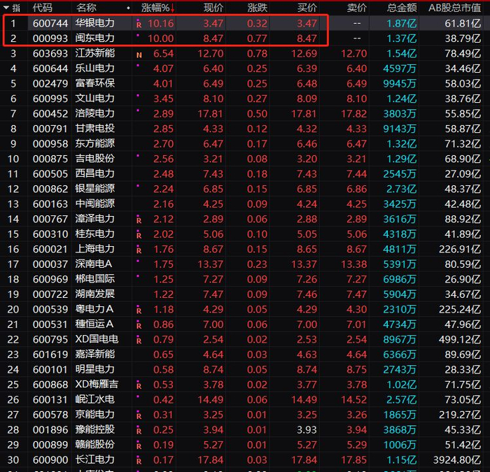 受政策影响,虽然今日股市走弱,但电力股逆势走强,华银电力、闽东电力涨停,江苏新能、乐山电力、文山电力也都大涨。