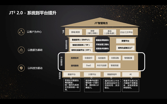 具体来说,原本面向产品设计、销售交易、资产管理、风险评估四大垂直功能领域的JT²系统目前解耦、扩展为7大中台服务模块,包括3大通用型服务模块(智能挖掘、DAAS、共识与加密服务),以及4大投资技术服务模块(估值定价、智能风控、智能配置、交易设施)。这7大中台服务模块既可以组装成完整的前台应用输出,又可以针对机构的业务实际需求重新组合,输出个性化业务解决方案。