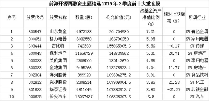 对比一季报,前海开源再融资前十大重仓股中,新进长安汽车、格力电器、洋河股份、山东黄金4只个股,游族网络、同花顺、亿联网络、三安光电退出前十大重仓股,同时对华泰证券进行减持操作。