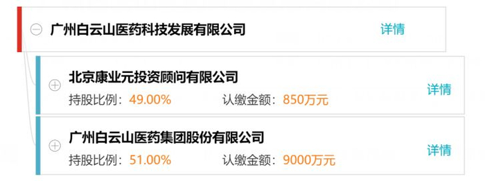 据公开资料显示,康业元投资是广州白云山医药科技发展有限公司(简称“白云山科技”)的股东之一,上市公司白云山持有白云山科技51%股权,康业元则持有剩下的49%的股权。白云山科技的主要经营范围是中成药、中药饮片批发、保健食品批复等业务。