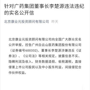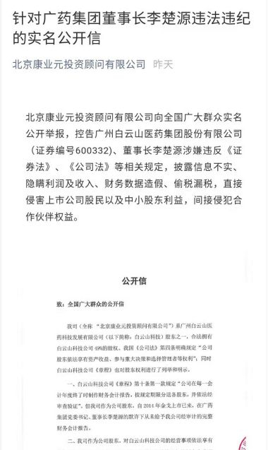 当天,北京康业元投资顾问公司通过社交媒体平台发布了针对广药集团董事长李楚源违法违纪的公开信。上述公开信详细陈述了康业元投资和白云山对旗下公司拳头产品“金戈”利益分配的矛盾,并列举了白云山董事长李楚源涉嫌违法违规、隐瞒利润收入、财务数据造假等行为。