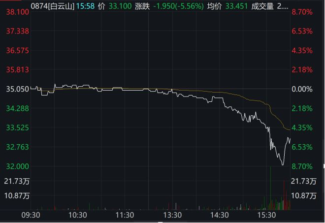 7月19日午后,白云山港股尾盘突然跳水,跌幅一度超过8%。截至当日收盘,白云山港股跌幅5.56%,市值蒸发超31.7亿港元。