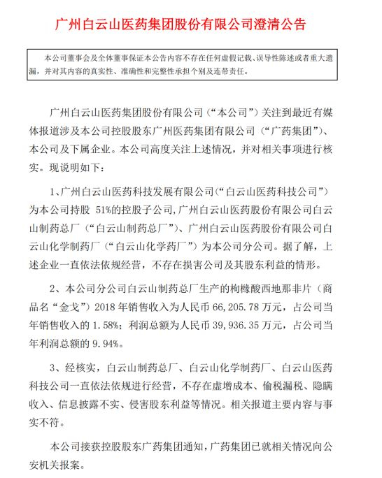 白云山表示,其子公司和分公司依法经营,不存在虚增成本、偷税漏税、隐瞒收入、信息披露不实、侵害股东利益等情况。相关报道主要内容与事实不符。此外,白云山在上述公告中也表示,公司接获控股股东广药集团通知,广药集团已就相关情况向公安机关报案。