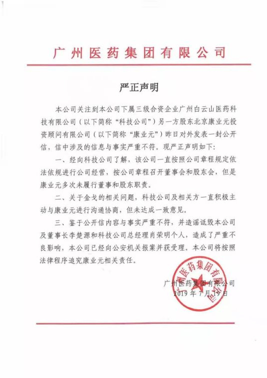 7月19日,白云山控股股东广药集团公开否认举报信内容,并声称合资公司及相关方积极沟通,但合作方康业元投资多次未履行董事和股东责任。广药集团表示,公司已经向公安机关报案并获受理。
