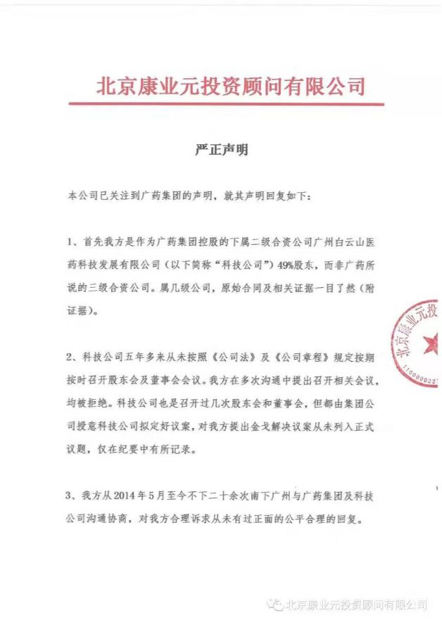 由于引起了多方关注,上市公司白云山的控股股东广药集团也在第一时间发出了公开声明,回应此次康业元投资举报白云山董事长一事。