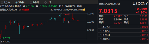 上午9时16分左右,离岸人民币对美元跌破“7”关口,最低贬值至7.0421,较上一交易日6.9764的收盘价和今日6.9778的开盘价大跌超过600点;受此带动,开盘后9点32分左右,在岸人民币兑美元汇率也迅速跌破7关口,最高报7.0424。