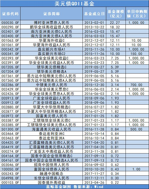 据wind数据统计,截至目前全市场共有24只美元债QDII基金,但普遍规模较小,仅有10只规模超过2亿元,且由于国内QDII额度的限制多处于单日限制申购状态,限制申购额从1万元到千万元不等。