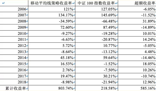 采取移动平均线策略,在过去2006-2018年的13个年度中,有7个年度相比中证100指数有超额收益率,累计超额收益率达到585.16%,最大年度跌幅为35%,也小于单独持有中证100指数最大年度跌幅66%。移动平均线策略有效控制了下跌的幅度,同时也能够分享牛市上涨的收益。