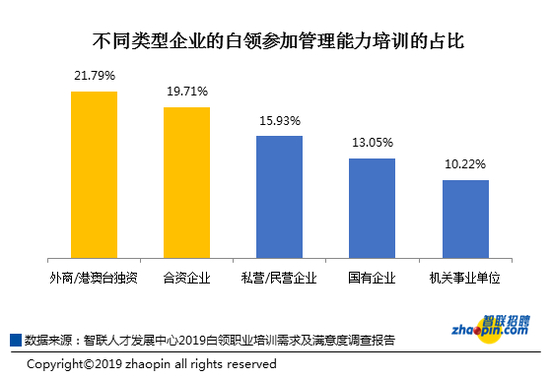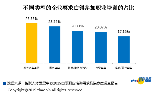 不过,在一些企业中也有要求白领参加职业培训的,表现最为突出的是机关事业单位,达25.55%,私营企业要求员工参加职业培训所占比重最少,仅17.16%。