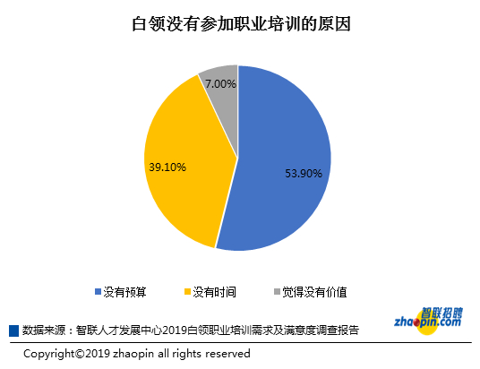 阻碍白领参加职业培训的原因也是多方面的,数据显示,没有预算和没有时间是阻碍白领参与职业培训的两大因素,分别占比53.9%和39.1%,由此可见,时间与金钱不可兼得依然是职业培训中普遍的困境。