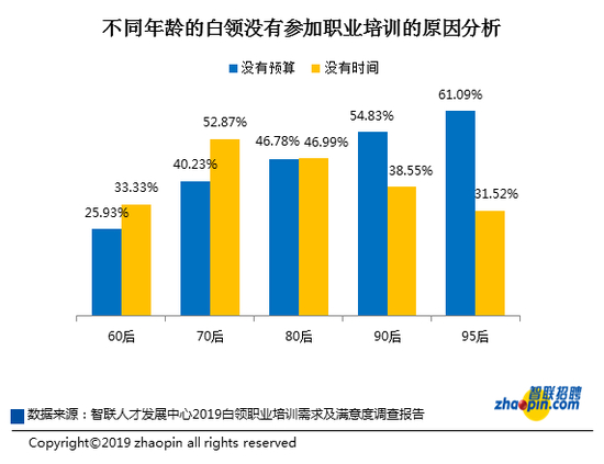 通过对白领没有时间参加职业培训的原因进行分析,发现其中超一半的70后、80后未能参加职业培训的主要原因没有时间,这个年龄段的职场人大多数都已迈入管理层,不缺资金实力的他们,时间反而成了一种奢侈;而近六成的90后、95后因为预算而止步于职业培训的门口,毕竟对于正面临或即将面临家庭压力的职场新人而言,职业培训也是一笔不小的开销。