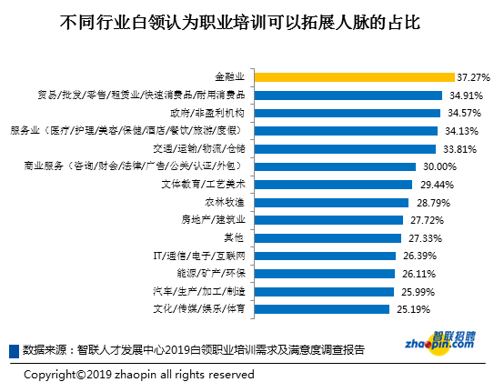 调查发现,部分行业对于拓展人脉也比较看重,金融业认为职业培训可以拓展人脉的占比达37.27%,居行业首位;贸易、服务业等这类普遍需要人际关系助力的行业中,也有超过三成的职场人参加培训的初衷是为了拓展人脉。