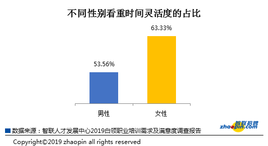 对比男女对时间灵活度的选择,63.33%的女性白领认为时间灵活度是主要考虑因素,较男性白领的占比多出10个百分点,这或许与不同性别角色所存在的家庭因素联系紧密。