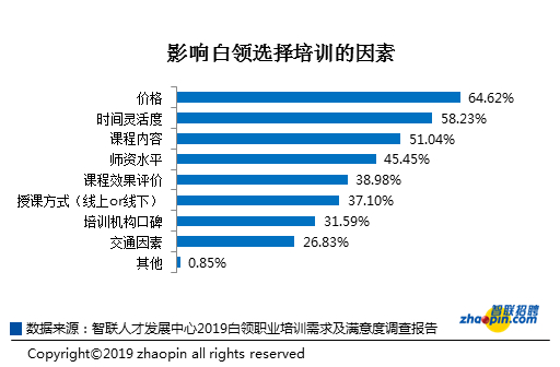 选择进行职业培训,白领们有很多的因素需要考虑。数据显示,64.62%的白领将价格作为选择培训的首要因素,58.23%的白领将时间灵活度作为第二考虑因素。