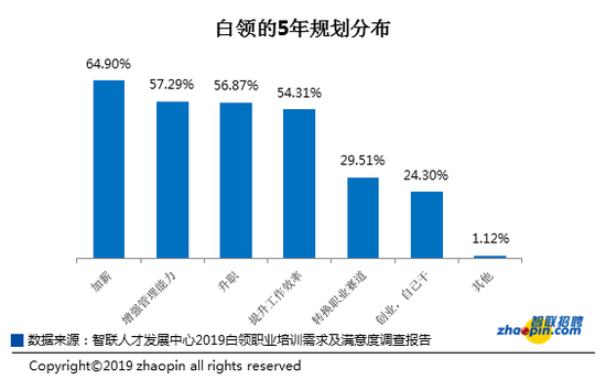 个人所参与的职业培训与未来的职业发展规划联系紧密,数据显示,白领对于自己的下一个5年规划中64.9%的白领渴望加薪,57.29%的白领渴望增强管理能力,56.87%的白领渴望升职;女性白领的职业发展渴望要大于男性。工作年限与升职提升工作效率呈反比趋势,工作十年以上的白领对自己的管理能力的提升期望较大,这大多与自身所处职位密切相关。