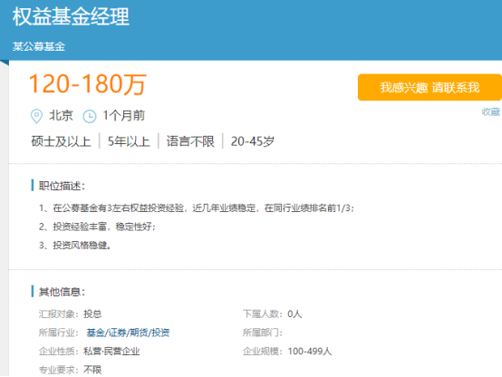 另外,基金君从招聘网站上也看到,北京某家公募是国内最早成立的十家基金管理公司之一,其最近招聘权益基金经理,给出的薪酬待遇是120-180万,要求基金经理在公募有3年左右的权益投资经验,业绩稳定在同行业排名前三分之一,投资风格稳健。
