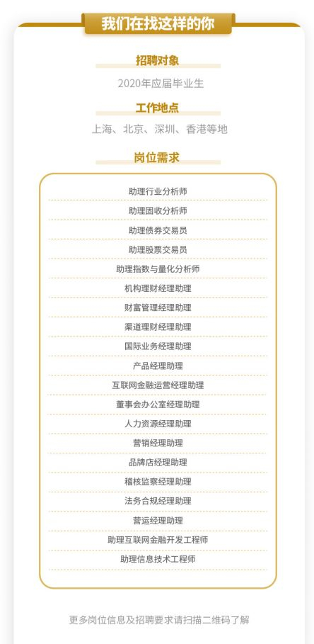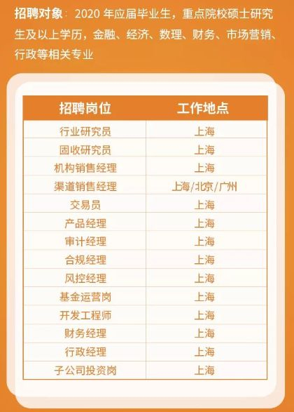 中欧基金也发出2020年毕业生“管培生”项目,招聘岗位包括业务发展部产品经理、零售业务部渠道销售、基金运营部基金会计、中央交易室股票/债券交易员、人力资源部人力资源、行政部行政等。