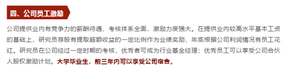 也有私募给出了有竞争力的薪酬待遇,激励力度较为强大,比如研究员荐股有提取超额收益的一定比例作为业绩奖励,年底根据公司利润情况有员工花红;研究员在公司经过一定时期的考核,优秀者可成为行业基金经理;优秀员工可以享受公司合伙人股权激励计划;大学毕业生,前三年内可以享受公司宿舍。