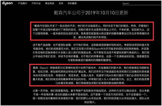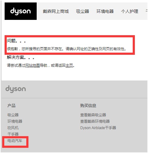 现在,虽然戴森中国官网仍旧有电动汽车链接入口,但具体页面已经不存在了。